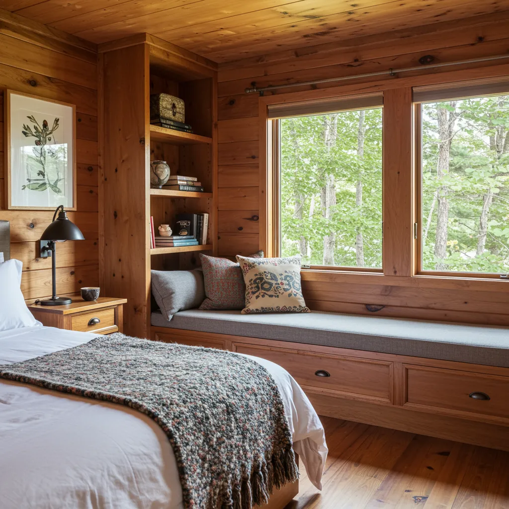 Cabin bedrooms often have to work harder than regular ones, especially if space is tight. That’s where built-ins save the day.