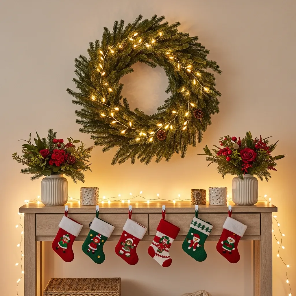 Don’t have a fireplace? Girl, same—for my first apartment. I turned my console table into a pseudo-mantel, and honestly, nobody could tell the difference. Wreath on the wall above it, stockings hanging from little command hooks (life-changing), some flowers in vases. Boom. Festive focal point created. No chimney required.