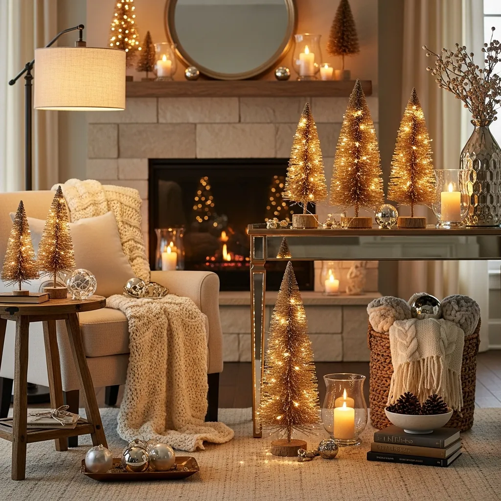 Those little champagne-colored tabletop trees are my weakness. I have, like, seven of them scattered around my house—on side tables, the coffee table, that weird corner shelf I never know what to do with the rest of the year. They catch the light from all the other twinkly things and create this warm, glowy atmosphere. Plus, they’re way easier than a full-size tree. No pine needles embedded in the carpet.