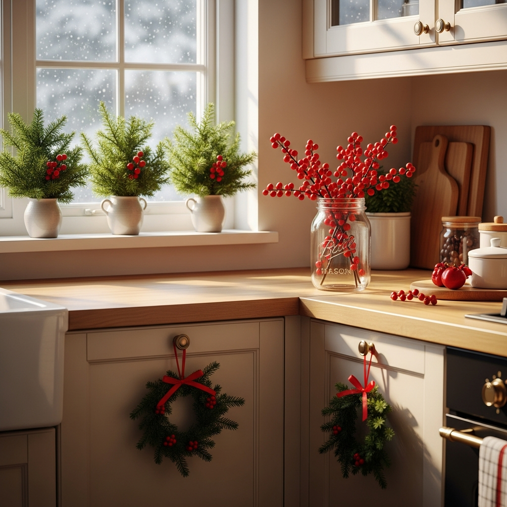 Your kitchen deserves some love too. I keep little evergreen arrangements on the windowsill above my sink, and every time I’m washing dishes (so, constantly), I get a little whiff of pine. It’s the small joys, you know? Holly berries in a mason jar on the counter. A tiny wreath on the cabinet. Suddenly the whole room smells like Christmas.