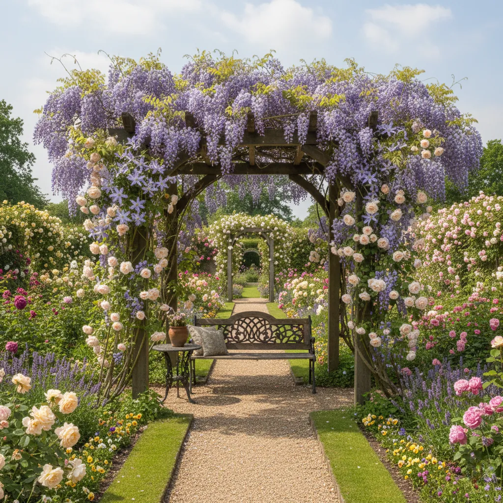- Train roses, wisteria, or clematis to grow over pergolas, arbors, and trellises for vertical interest