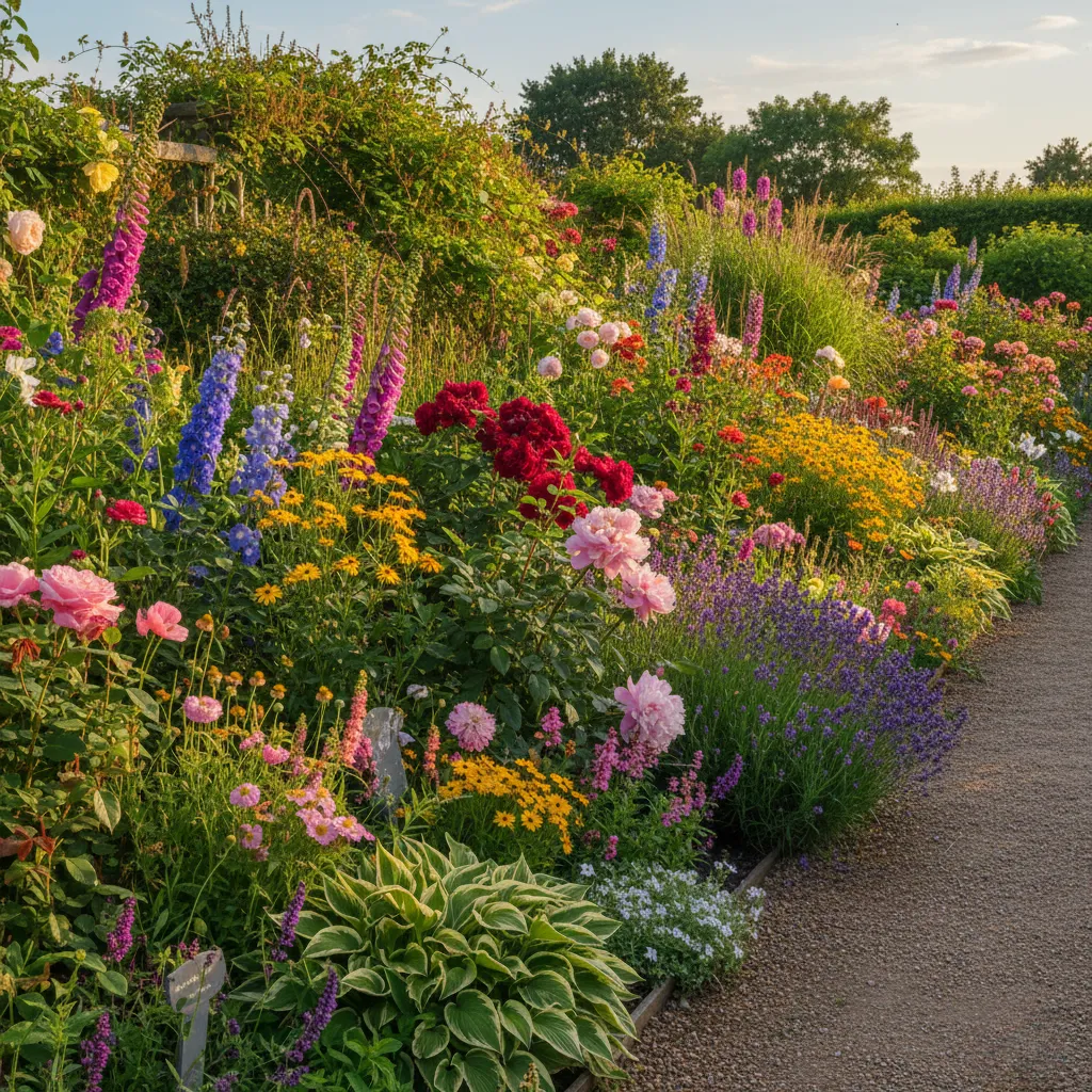 - Combine perennials, shrubs, and annuals in densely planted borders that are staples of English gardens