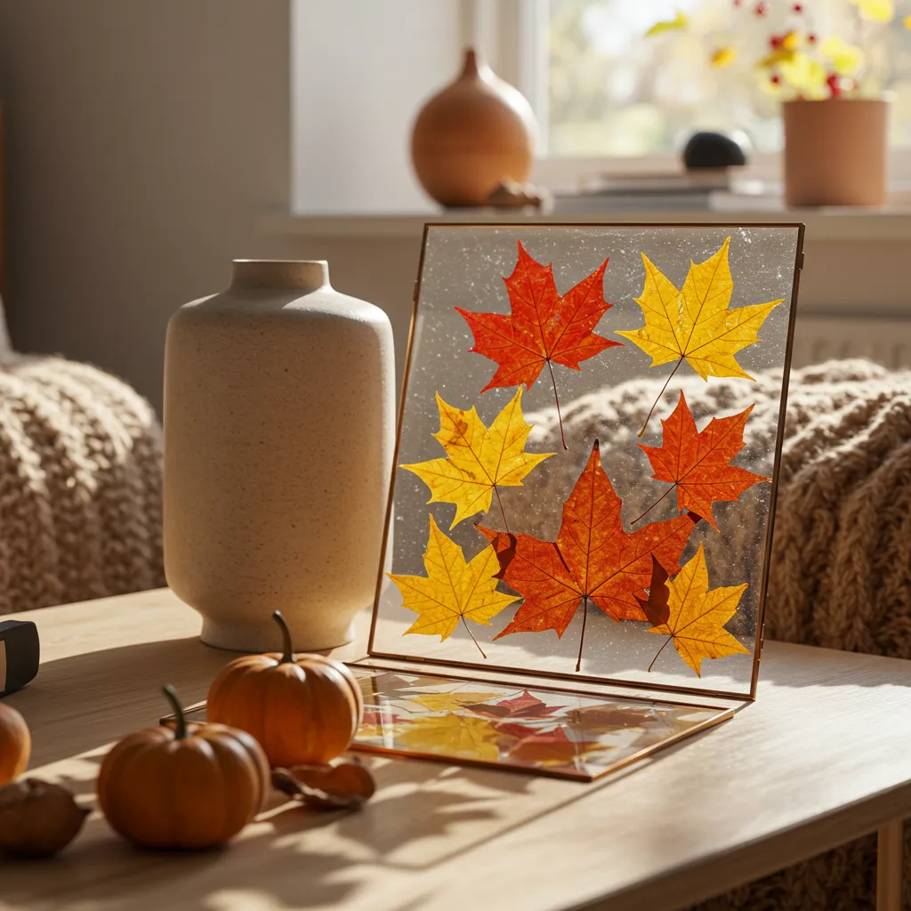 Pressed maple leaves in floating frames—literally free art from your yard. Prop them on your tray or against a vase. No leaves nearby? Botanical prints do the trick.
