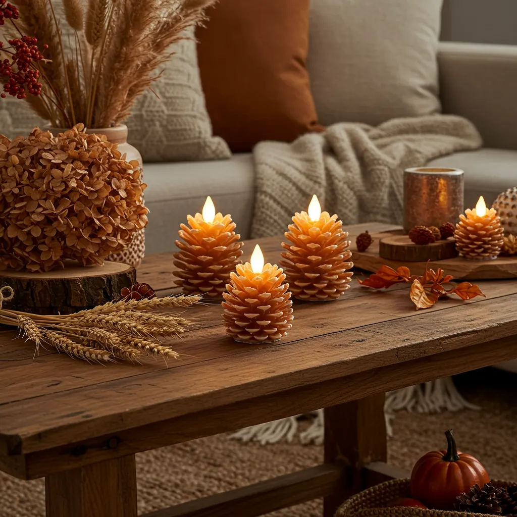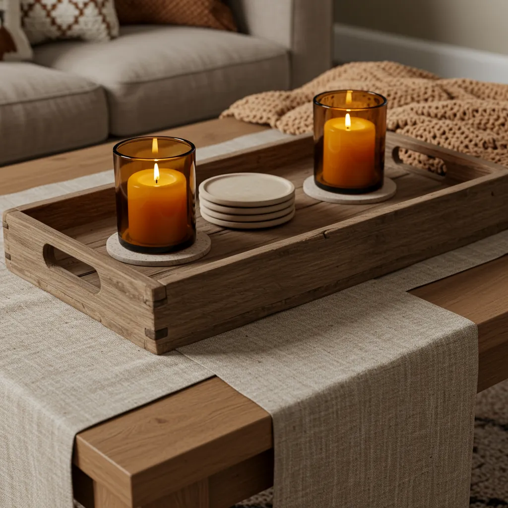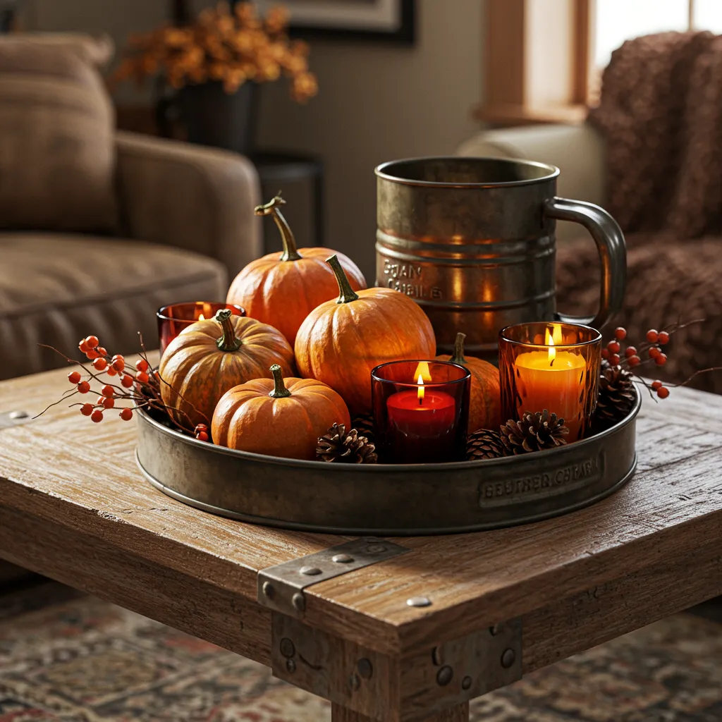 Start with a wooden tray and add a rust-colored linen runner—or honestly, any fall-ish fabric you’ve got. Pop in some amber glass candles (the flicker makes everything instantly cozy) and a couple ceramic coasters. It looks pulled together without making your morning coffee a balancing act.