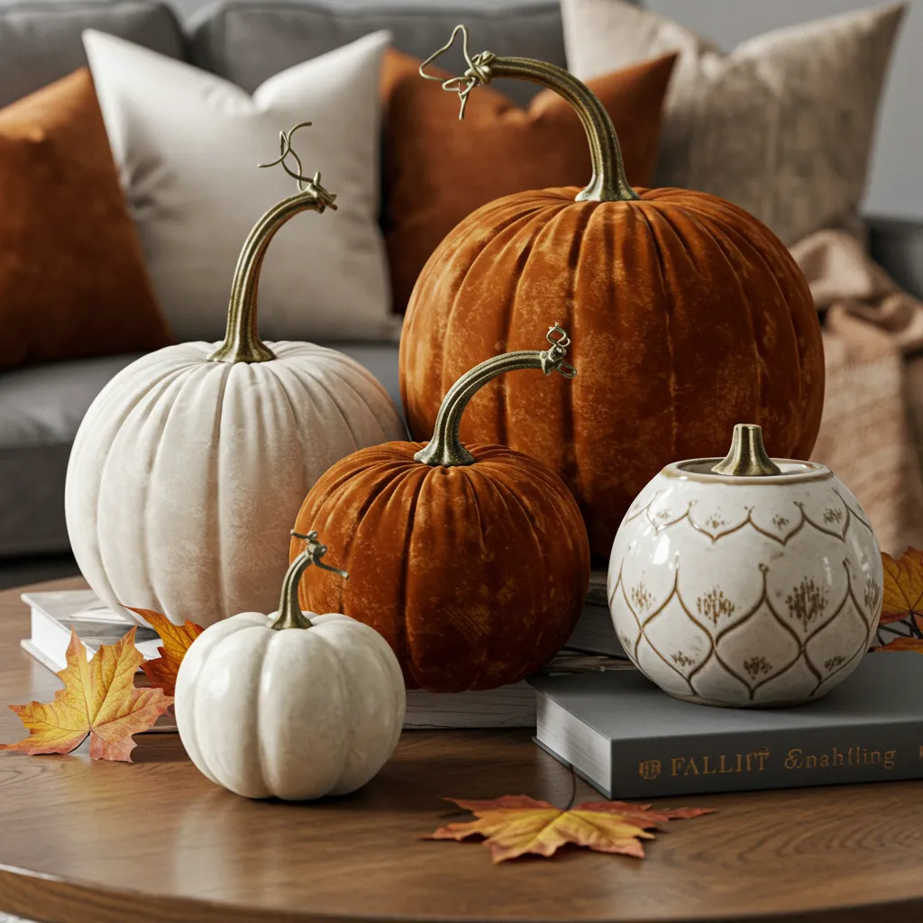 Three pumpkins: different sizes, different textures. One real (until it gets questionable), one velvet, one ceramic. Keep them clustered, not scattered—it looks intentional instead of random.