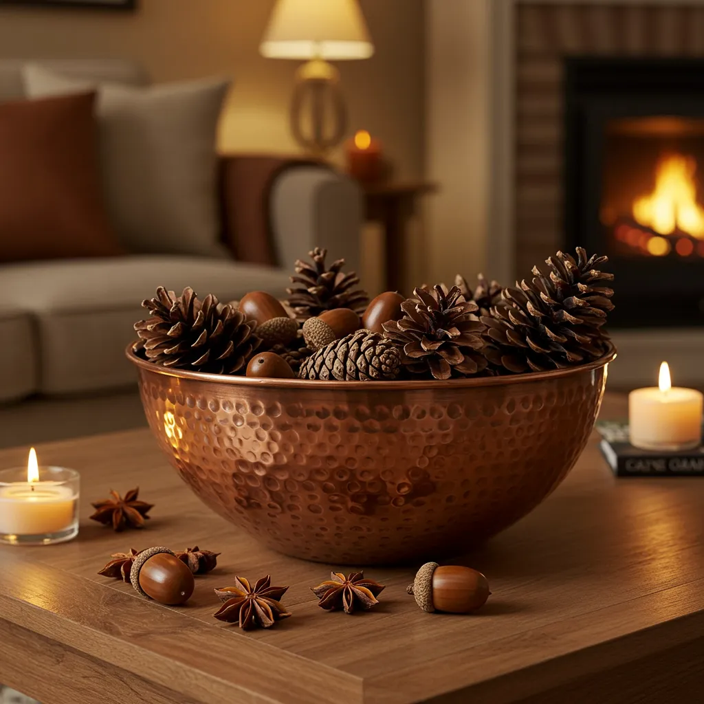 Fill a hammered copper bowl with pinecones, acorns, and star anise. It smells subtly woodsy and gives your hands something to fidget with during movie nights. No copper? Matte black works too for a modern vibe.