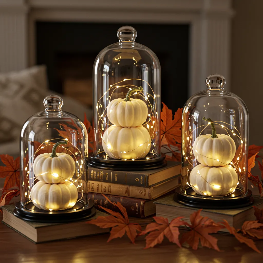 Mini white pumpkins under glass cloches. Place them on stacked books, tuck fairy lights inside, and voilà: a chic little fall snow globe.