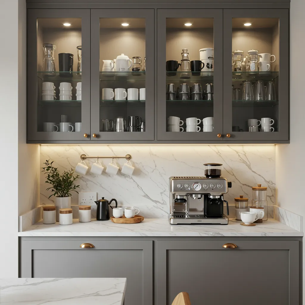 After living with coffee mugs shoved into random cabinets for years, I finally installed these sleek glass-front cabinets, and honestly? It was like giving my kitchen a personality transplant. You know that satisfying feeling when you can actually see your pretty mugs instead of playing hide-and-seek every morning? Plus, no more mystery stains on forgotten cups hiding in the back. I added little LED strips underneath because, let’s face it, we’re all basically vampires before our first cup, and that soft glow makes everything feel less hostile at 6 a.m.