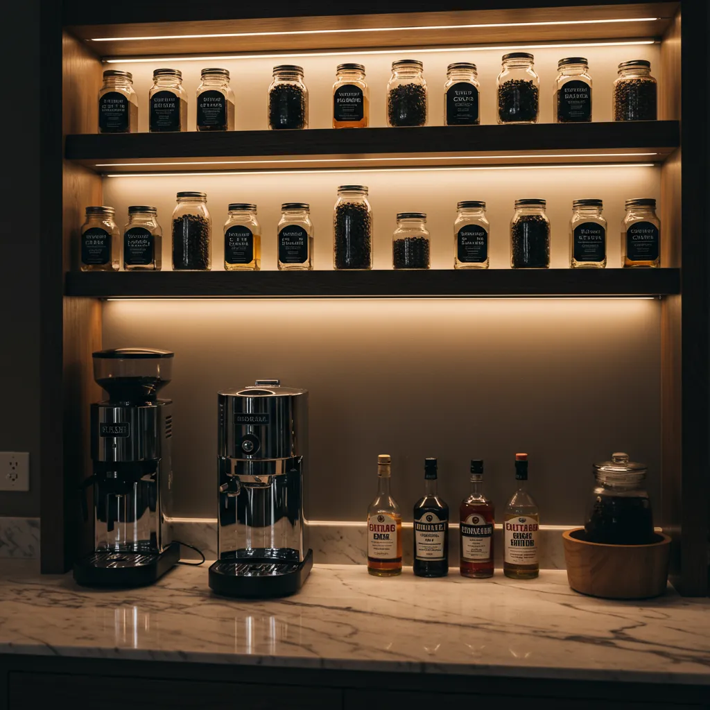 Okay, this one’s for my dramatic friends out there. Remember those fancy cocktail bars with the glowing bottles? Yeah, I basically did that—but with coffee beans and fancy syrups. The backlighting makes everything look Instagram-ready, which is great because I definitely take photos of my coffee setup way more than a normal person should. Fair warning, though—marble countertops look amazing but show every single water spot. Every. Single. One.