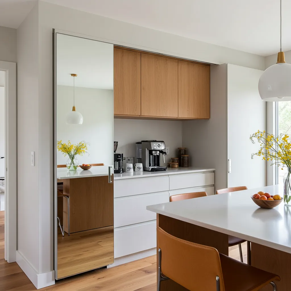 My friend Sarah has this setup where her entire coffee station just… vanishes. Sliding doors, like magic. Perfect for those of us who want to pretend we’re organized humans when guests come over, but also need to hide the evidence of our 3 p.m. stress-latte sessions. The mirrored doors are genius too—suddenly, her small kitchen looks twice as big. Sneaky, right?