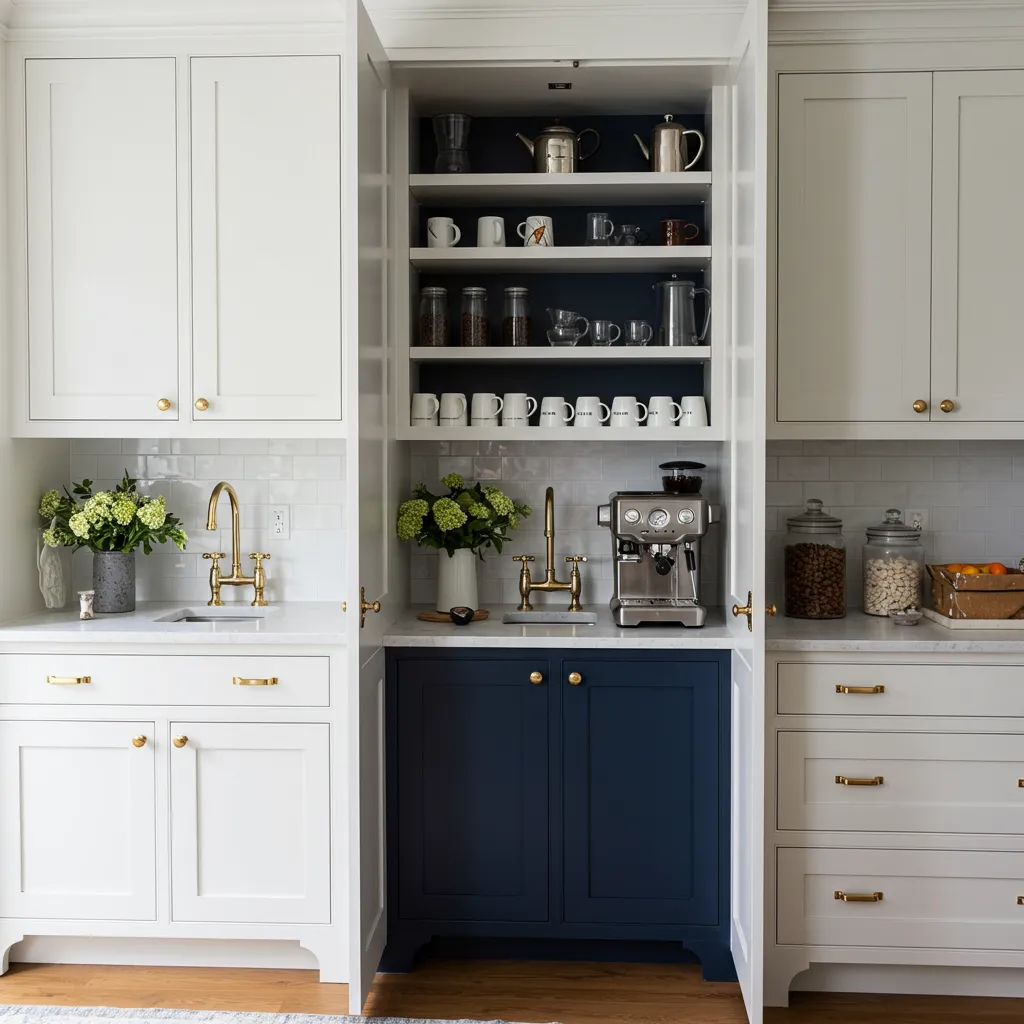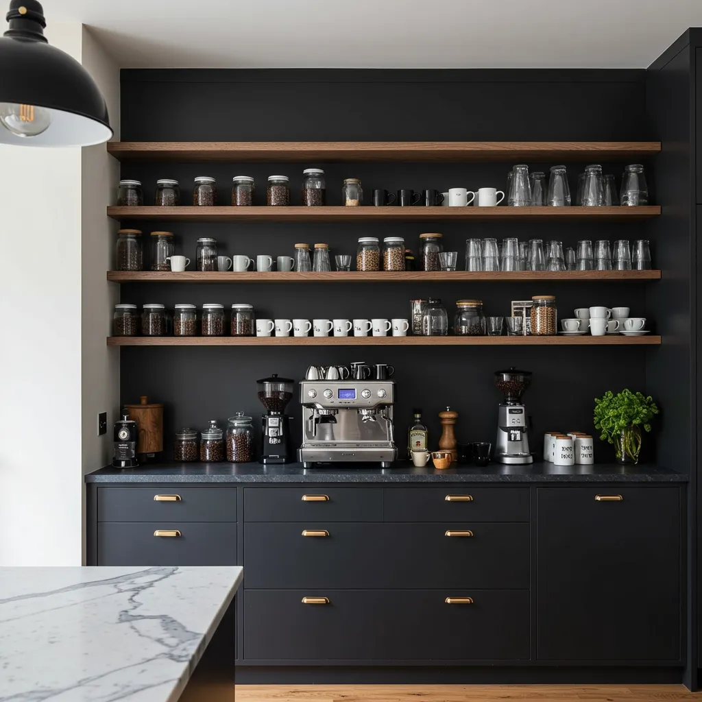 This one’s not for the faint of heart—or the small of space. I’m talking floor-to-ceiling dedication to the bean. It’s like having a coffee museum in your kitchen, which sounds excessive until you realize you can finally display every cute mug you’ve collected over the years. Plus, those decorative jars filled with different coffee beans? Pure eye candy. Just don’t ask me how long it takes to dust all those shelves.
