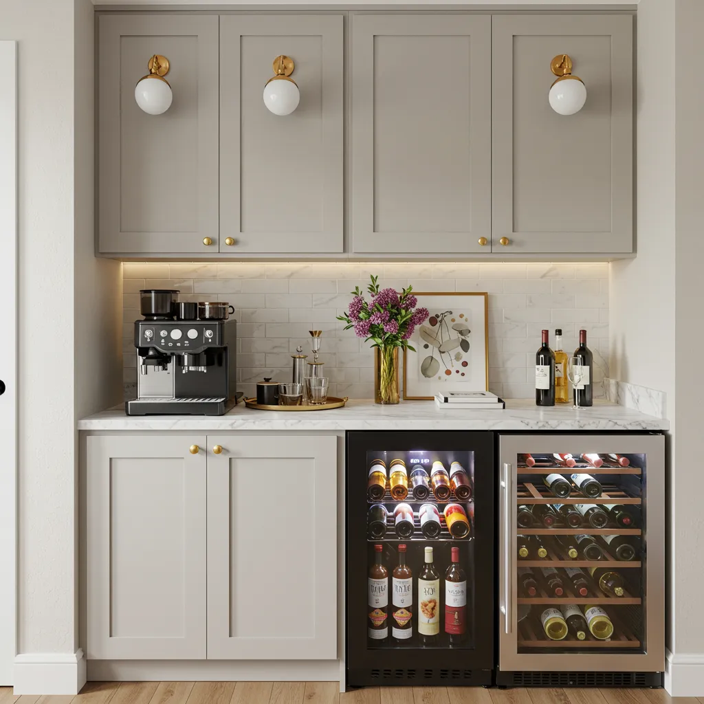 Why choose? My setup transitions from morning espresso to evening wine like some kind of magical transformation. Coffee machine on one side, wine fridge on the other, and cabinetry that doesn’t judge my beverage choices. Perfect for those “it’s 5 o’clock somewhere” moments—or when you need to caffeinate before you celebrate.