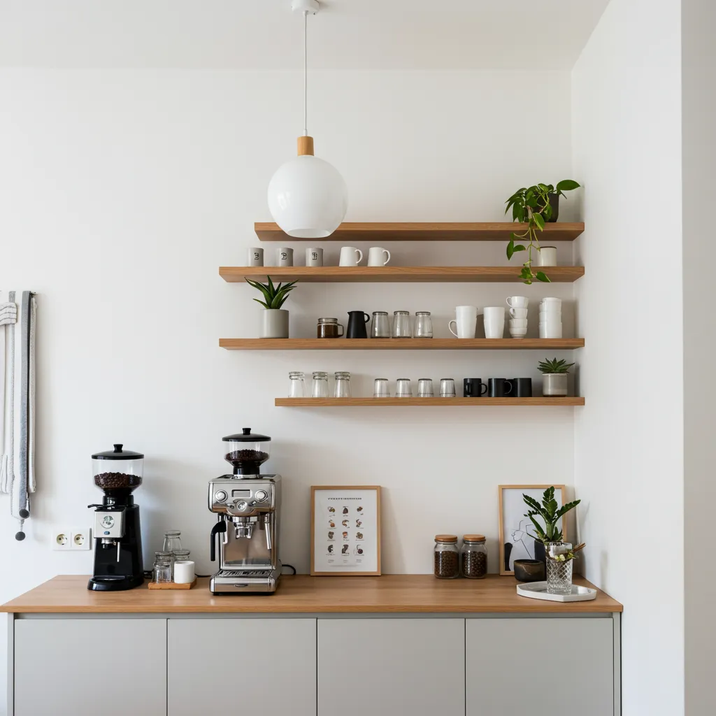 Sometimes simple is perfect. These shelves literally look like they’re defying gravity, which matches how I feel before my first cup. I added a few small plants because apparently, I’m the type of person who talks to succulents now, and the whole corner became this zen coffee meditation spot. Even tiny spaces can handle this magic trick.