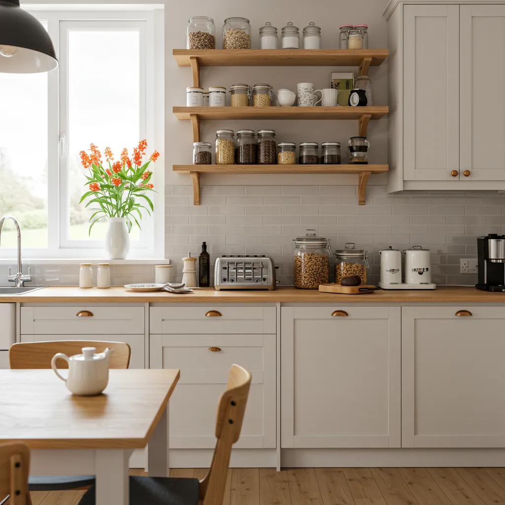 This look is for anyone who’s ever thought, “You know what my kitchen needs? More metal pipes.” I went full industrial with exposed everything, reclaimed wood that actually has stories to tell, and those galvanized buckets that somehow make storing coffee pods feel edgy. Pro tip: those metal hooks under the shelves? Perfect for displaying mugs and making you feel like you run a hip café instead of just drinking too much caffeine.