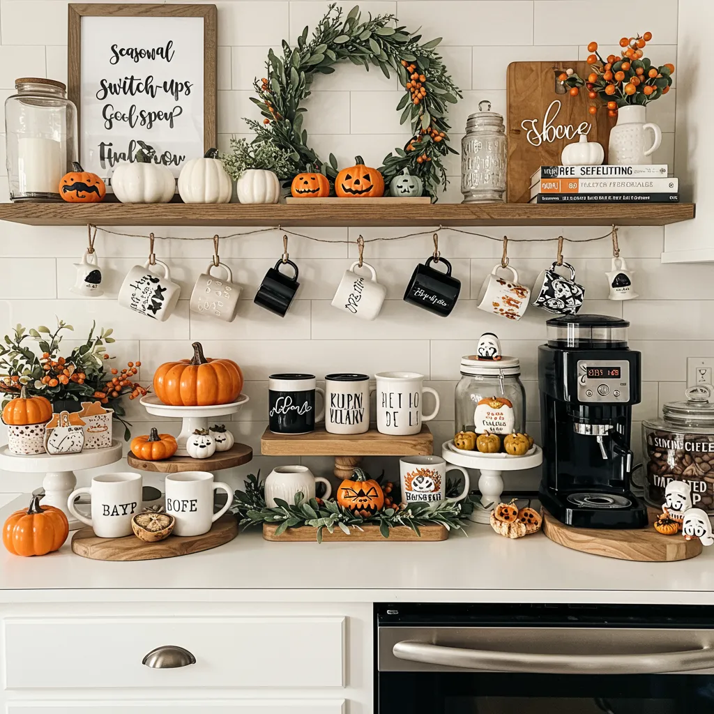I made my coffee bar changeable because I’m one of those people who decorates for every possible occasion—Halloween mugs in October, evergreen sprigs in December, and yes, I have Valentine’s Day coffee accessories. The decorative trays make swapping things out super easy, and it keeps the space feeling fresh without major renovations.