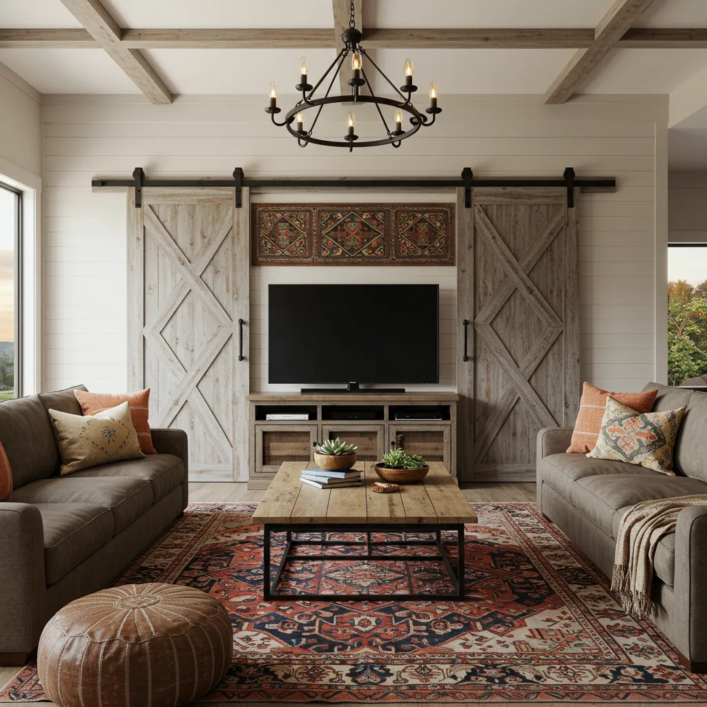 Weathered barn doors as a focal point? Could go very wrong, very fast. But when done right—like Sarah’s sliding doors that frame her TV area—they add that horizontal drama without screaming “look at me.” Paired with ethnic rugs and southwestern pillows, it feels authentic rather than themed.