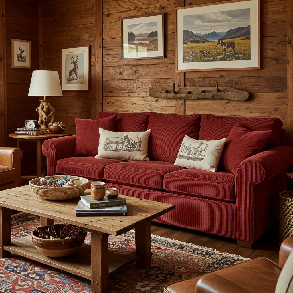 This one’s tricky because it’s so easy to go overboard. Sarah’s got this crimson corduroy sofa (I know, I know—corduroy—but hear me out) surrounded by woven bowls she actually uses for keys and random stuff, vintage art that looks like it has stories, and knotty wood walls that somehow don’t scream “hunting cabin.” The secret sauce? Everything has a purpose. No fake deer heads here—just real life that happens to look amazing.