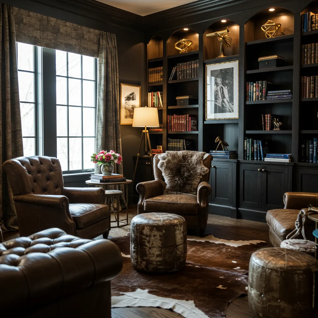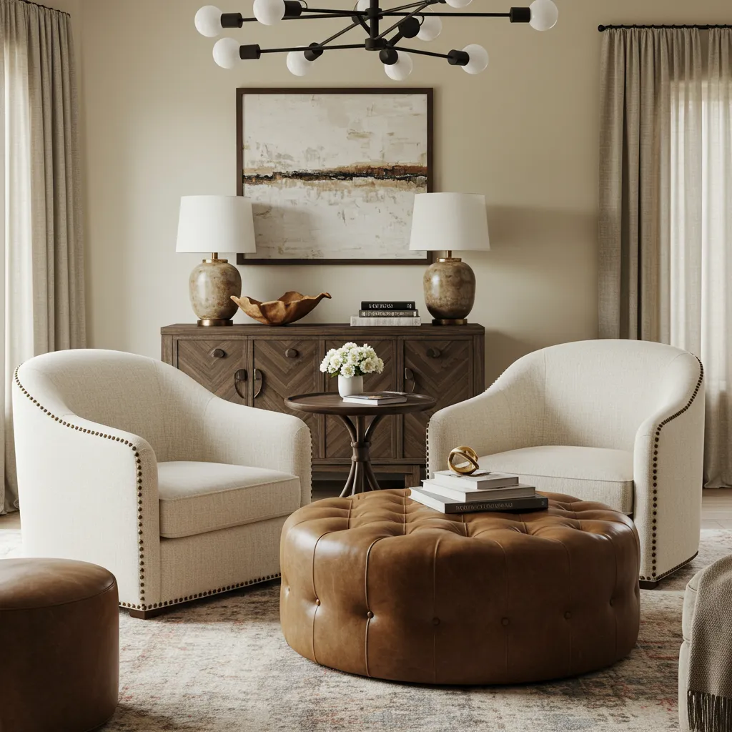 This is where modern western gets sophisticated—and honestly, where I initially failed spectacularly. Think curved cream chairs with nailhead trim paired with a leather-tufted ottoman that doubles as extra seating when your sister brings her entire family over unannounced. It’s that balance between “I could rope cattle in this” and “but I’d rather host book club.”