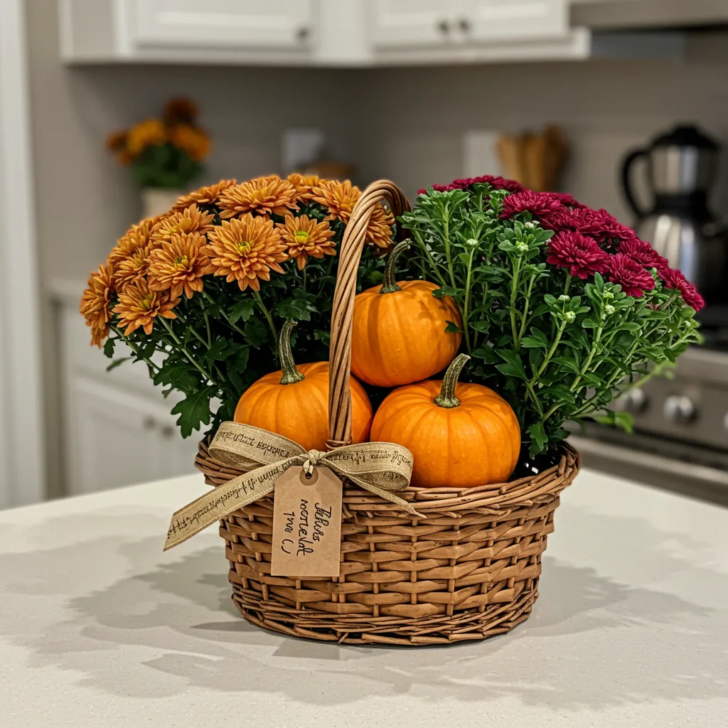 Tuck a couple of mini pumpkins into a shallow basket with mums, asters, and some green sprigs. Add a ribbon and you’ve got a lovely hostess gift.
