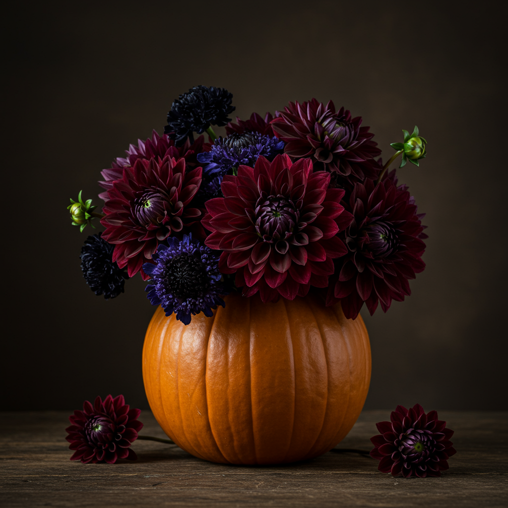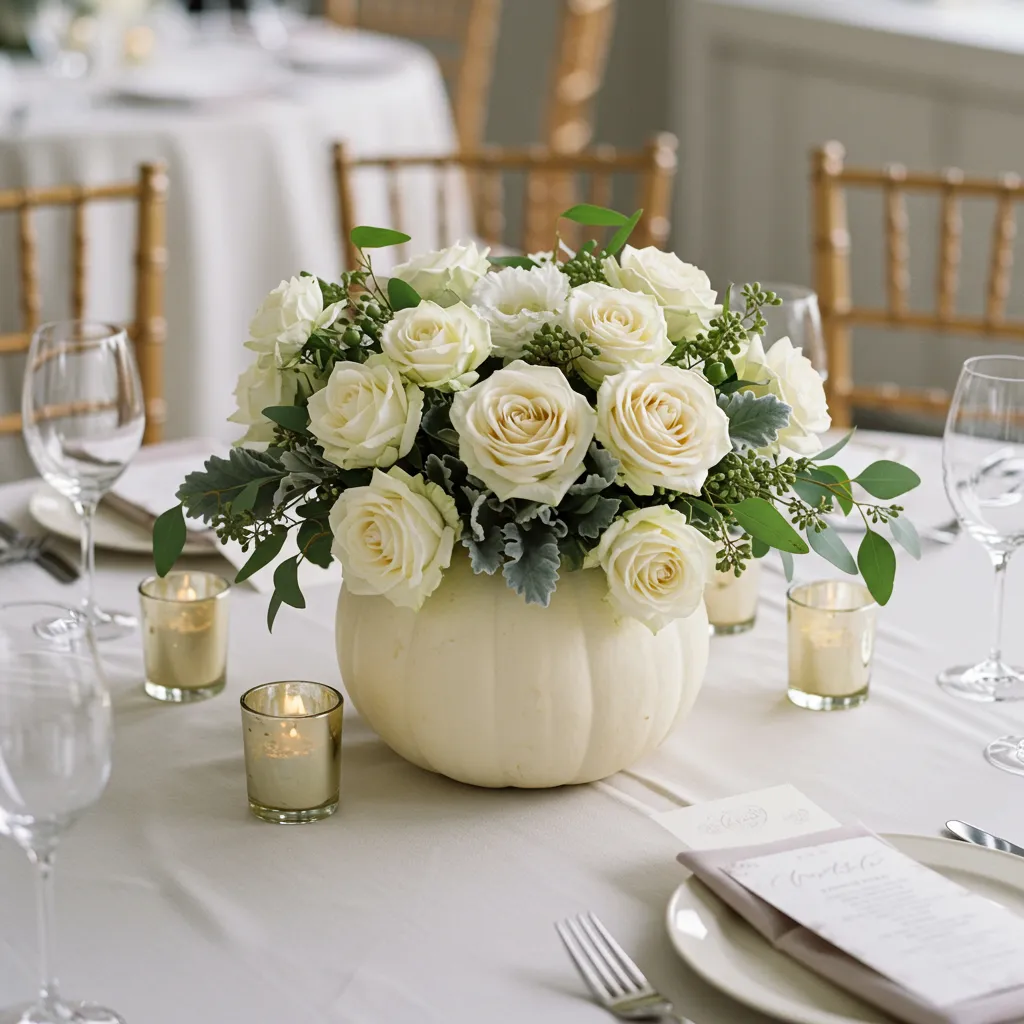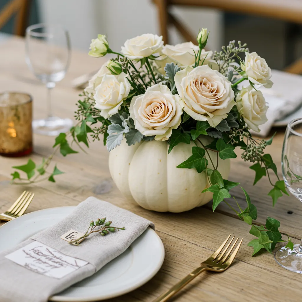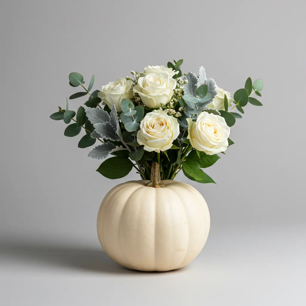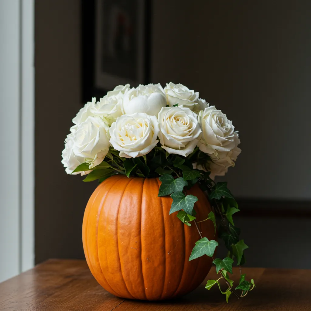 Use a taller pumpkin as your “vase” and let ivy or trailing eucalyptus spill down the side. Add a tight bunch of white roses or peonies on top. It feels dramatic but effortless.