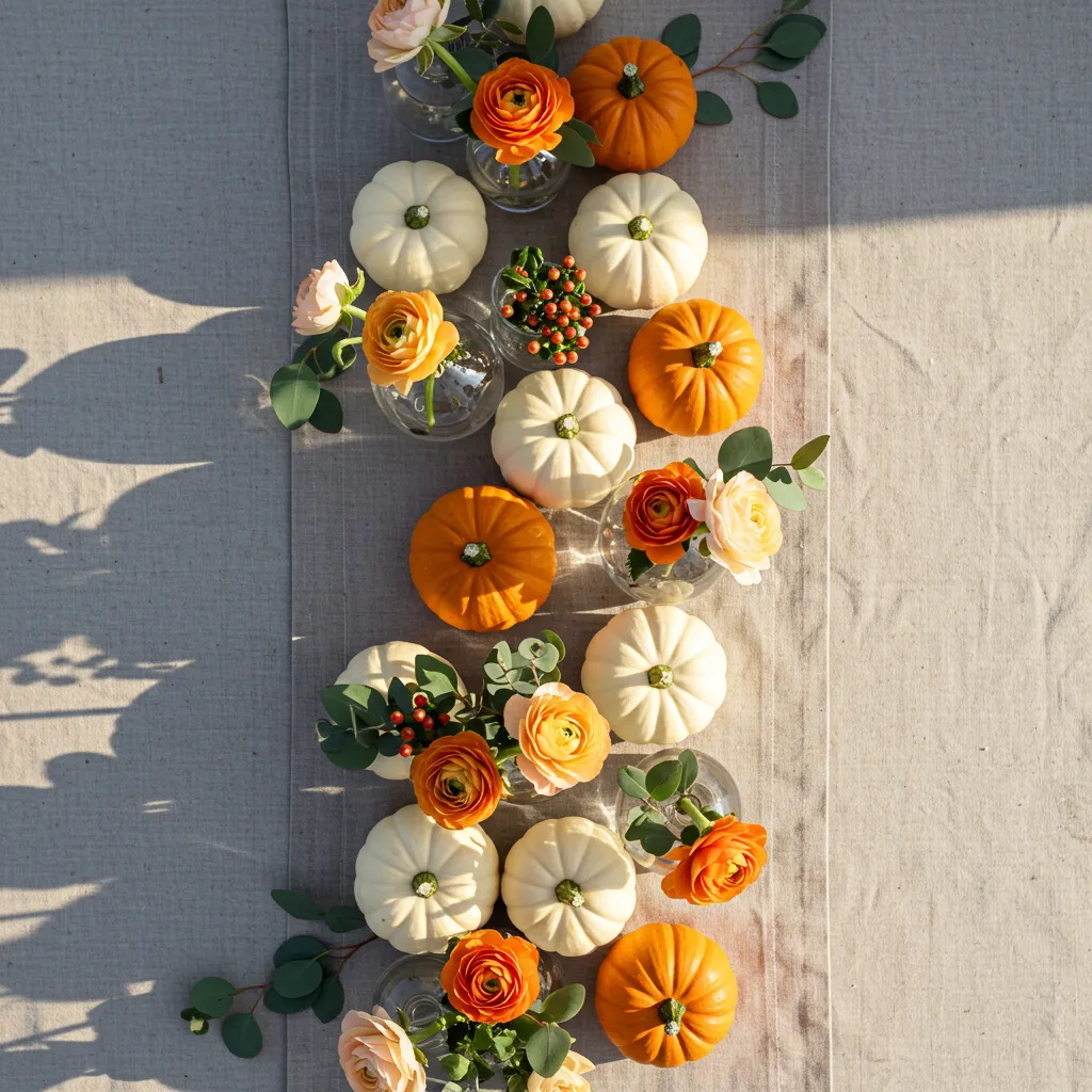 Line up 6–8 mini pumpkins down the center of your table. Between them, drop single stems into tiny bud vases — one ranunculus or a sprig of spray roses per vase. Clean, repeated shapes = instant design win.