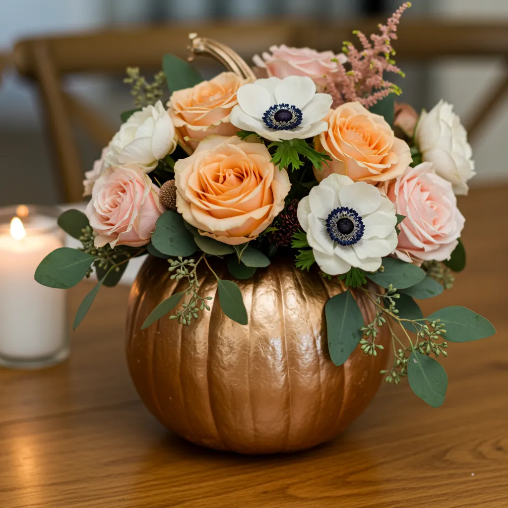 Spray a pumpkin gold or copper and fill it with garden roses and anemones. The shimmer makes simple flowers suddenly dinner-party-ready.