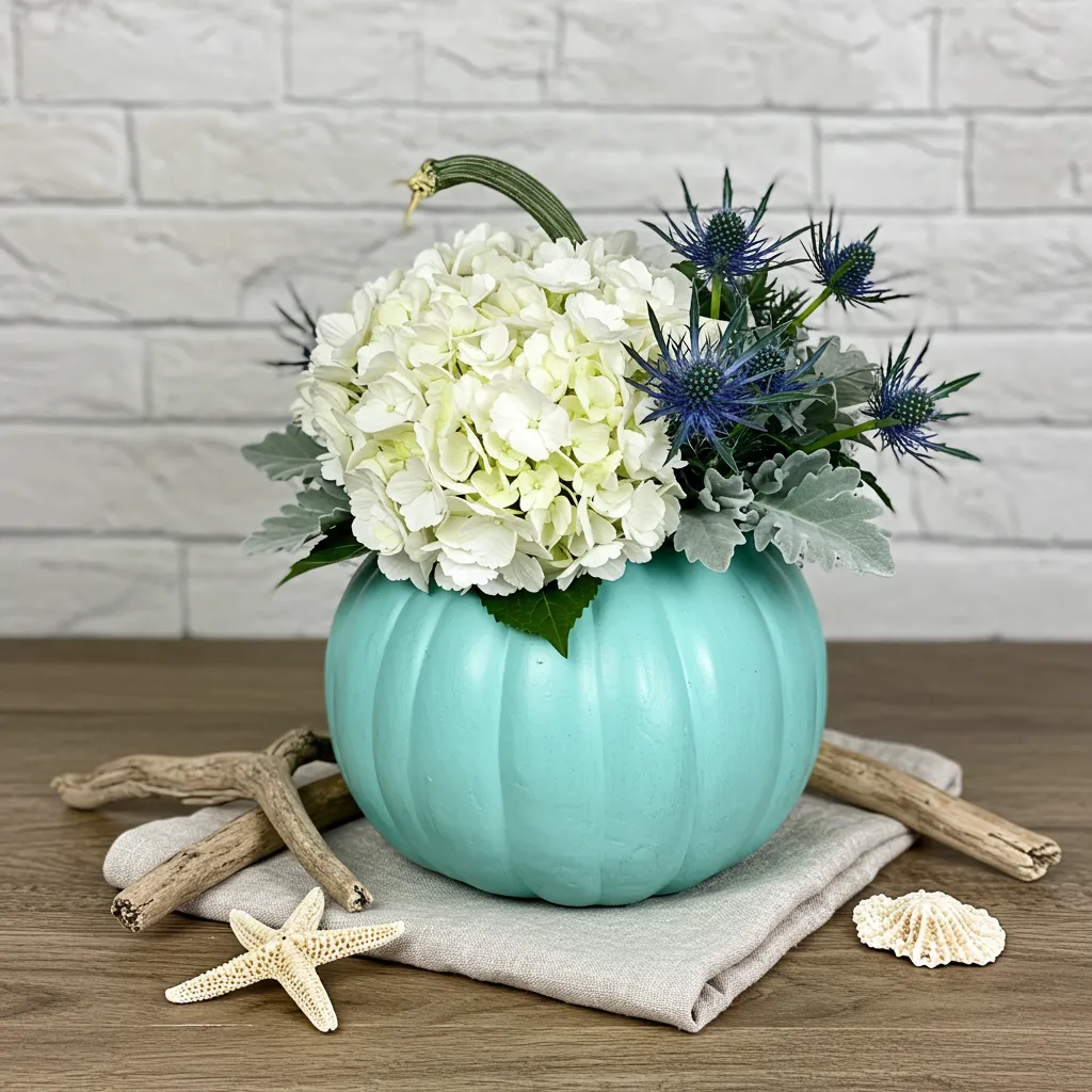 Paint a pumpkin pale teal or sea-glass and pair it with white hydrangeas, dusty miller, and a few blue thistles. Unexpected but surprisingly soothing.
