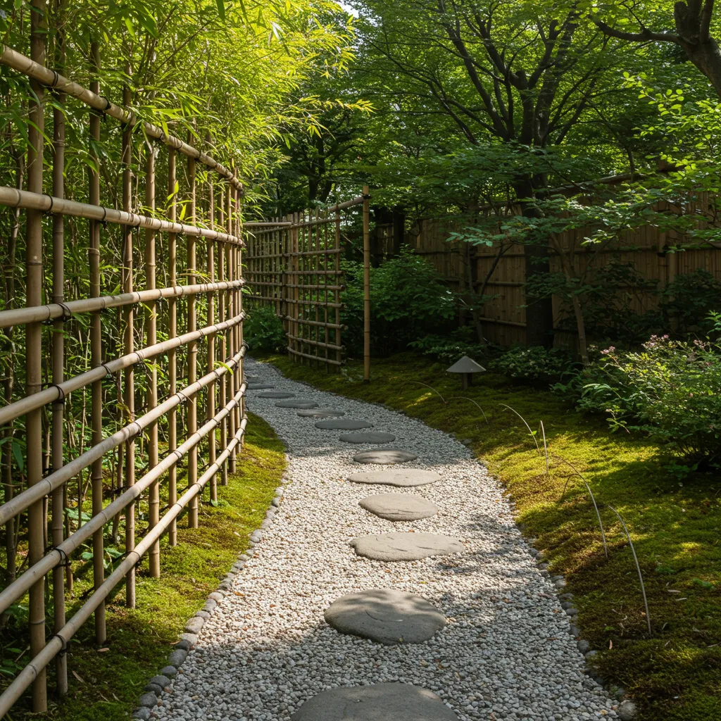 Bamboo is like duct tape in Japanese gardens—fences, paths, trellises. Mine’s woven into a little fence that curves alongside my gravel path. It creaks slightly in the wind, which I kind of love.
