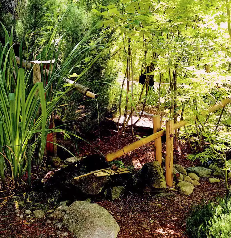 There’s this old-school bamboo trick—it tips over when filled with water and makes a clunk that apparently scares deer. Around here, it mostly startles my cat, but I still keep it. It’s charming in a slightly goofy way.