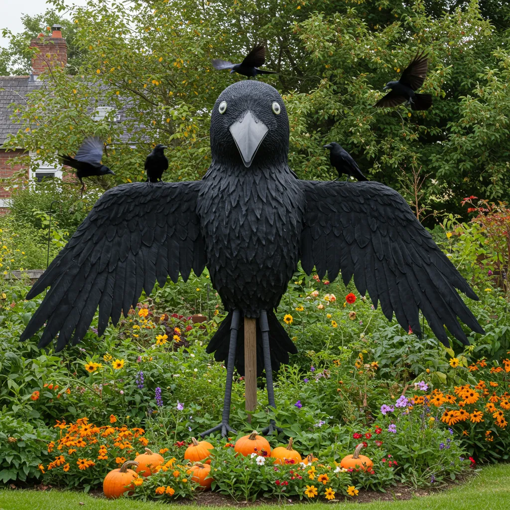 The real crows? Confused. They circle him, land nearby, tilt their heads. Best garden psychology experiment I’ve ever run.