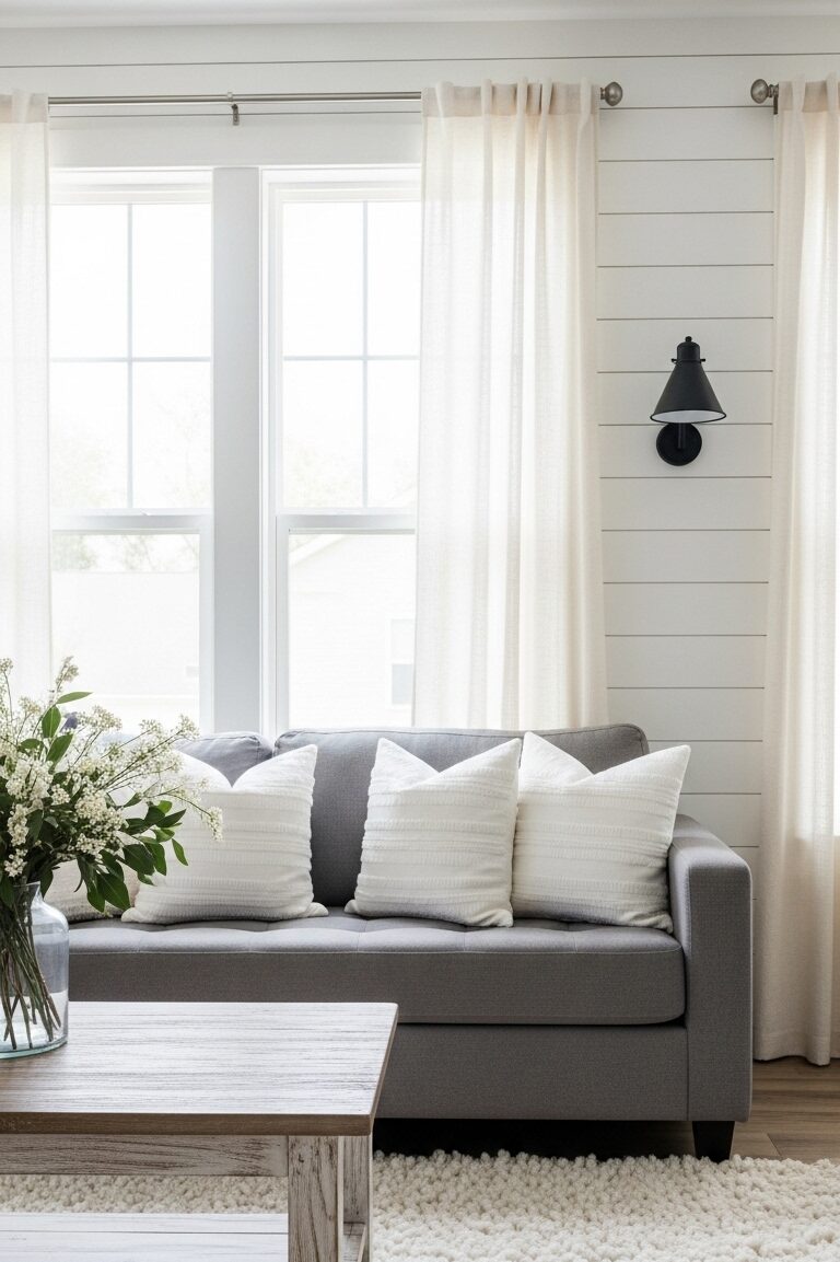 Plus, they’re perfect backdrops for your farmhouse decor, making your living room feel inviting and uniquely yours. Incorporating vintage-style lighting will further enhance the inviting atmosphere.