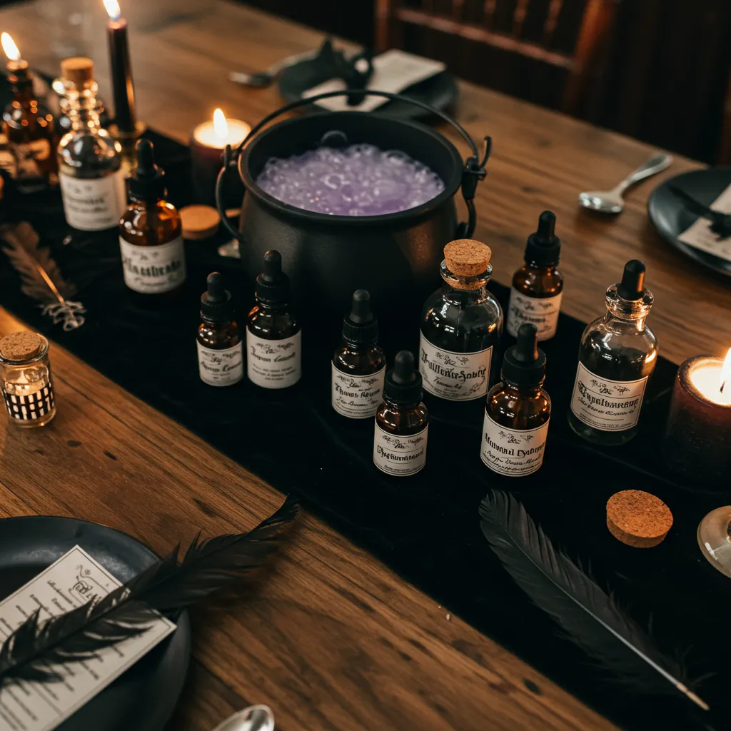 Set a cauldron on a runner and ring it with labeled apothecary bottles, glass droppers, and corked vials. Add black candles, scattered faux raven feathers, and a handwritten “Brew Menu” for an immersive tablescape.