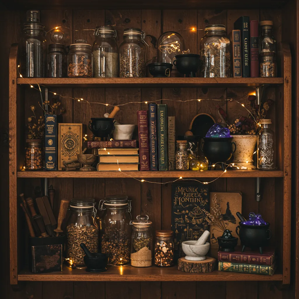 Arrange multiple small cauldrons on a kitchen shelf beside herb jars, mortar and pestle, and spellbook props. Interweave fairy lights and cobwebbing for a layered, lived-in witch’s cottage vibe.