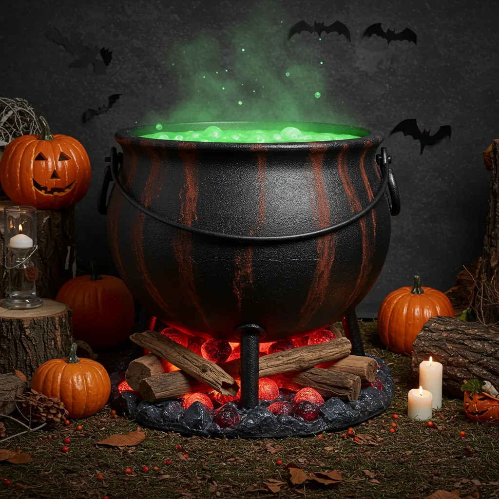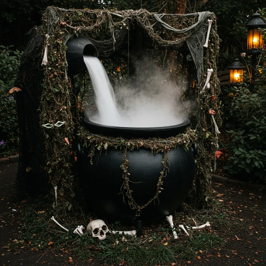 Build or upcycle an oversized cauldron as a statement prop. Give it a faux cast-iron finish with textured spray and dry-brushed rust tones, and stage driftwood or resin “coals” with flicker LEDs beneath for photos.