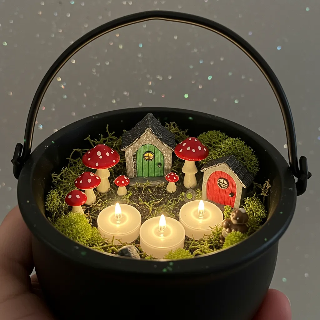 For a softer, whimsical take: fill with moss, battery tea lights, tiny mushrooms, and miniature fairy doors. Sprinkle iridescent “fairy dust” glitter and use warm white lights for cozy glow.