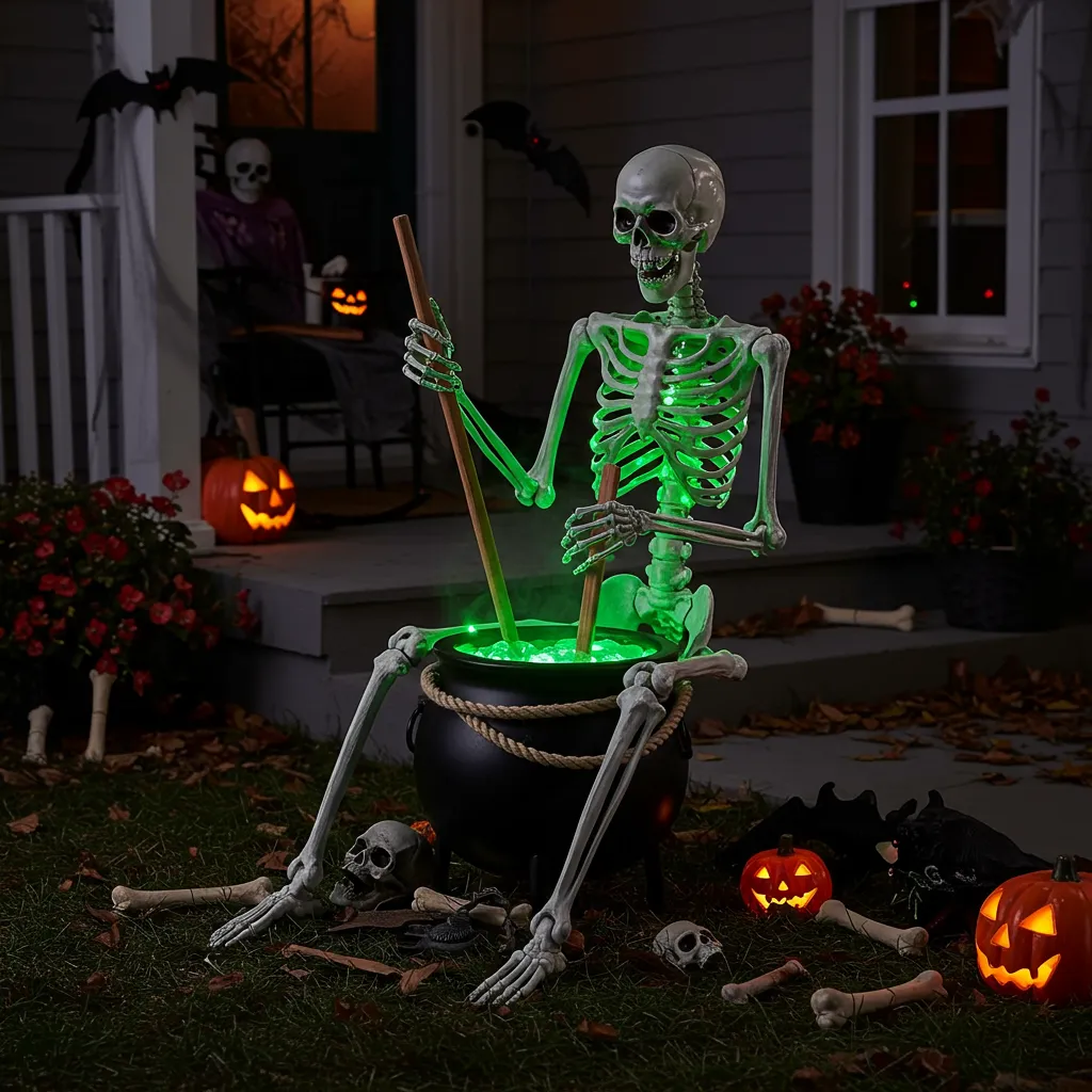 Pose a life-size skeleton with one hand on a wooden spoon “stirring” the cauldron. Fill with faux bones, rubber bats, and green rope lights for a playful haunted-house moment on the porch or entry.