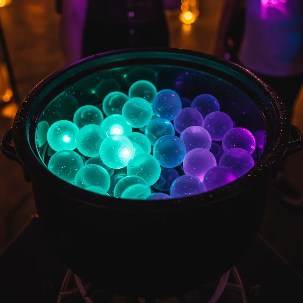 Fill the cauldron with translucent “orbs” (clear plastic ornaments or ping-pong balls) and underlight with RGB LEDs. Cycle through greens, violets, and blues to suggest enchanted ingredients swirling within.