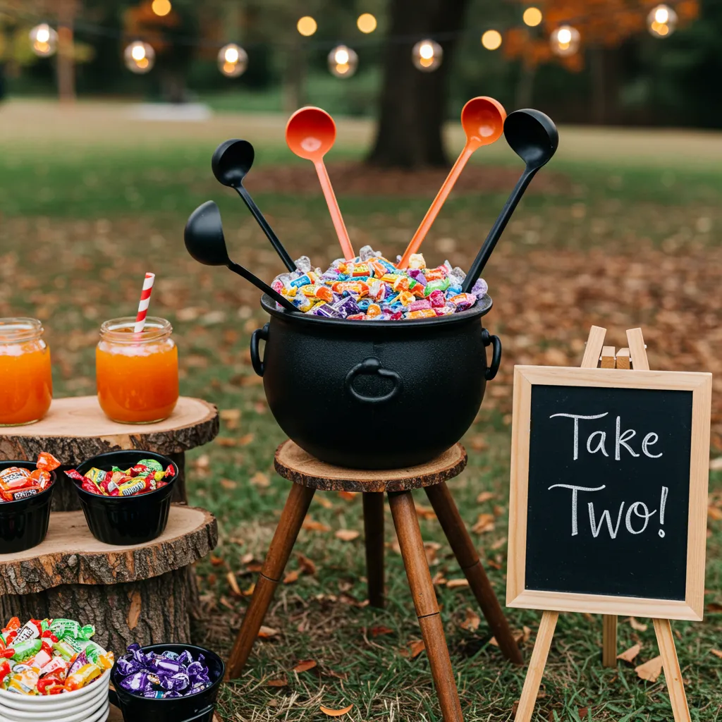 Turn a medium cauldron into a party candy station. Mount on a rustic stool or tripod, line with food-safe bowl insert, and add swinging ladles or mini tongs. Finish with a cheeky sign like “Eye of Newt—Take Two!”