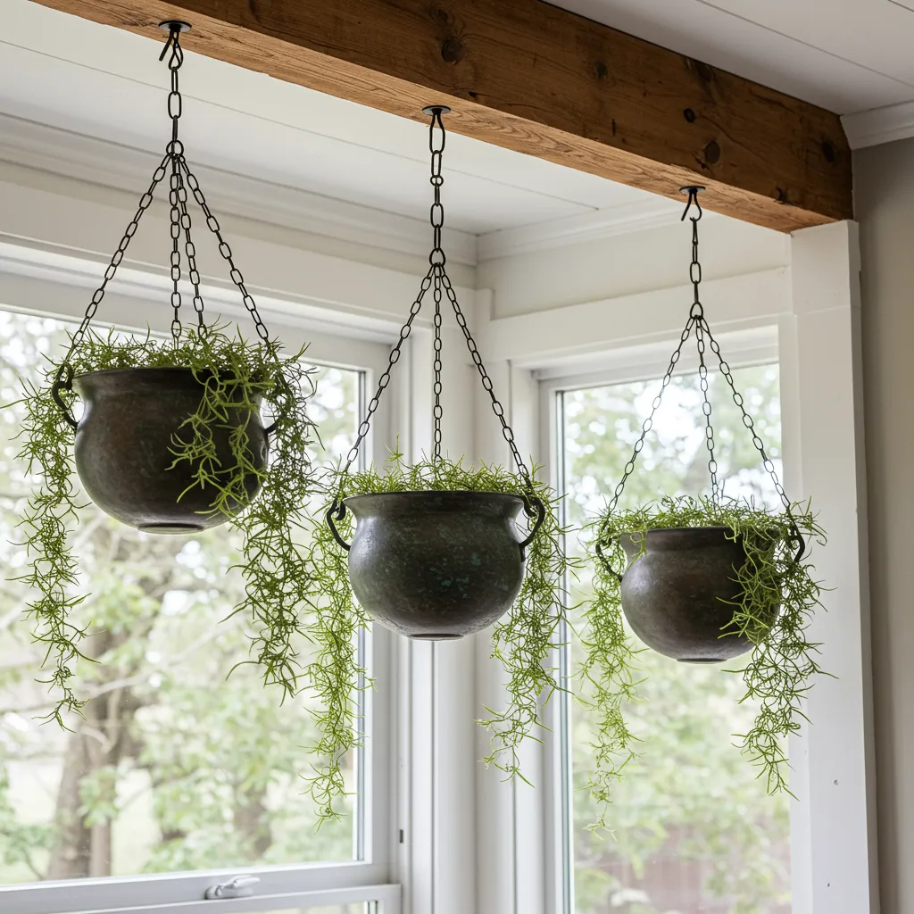 Suspend lightweight cauldrons from ceiling hooks or a mantel beam with sturdy chain, then fill with cascading faux vines or Spanish moss. Metallic spray in antique brass or verdigris gives a vintage apothecary look.
