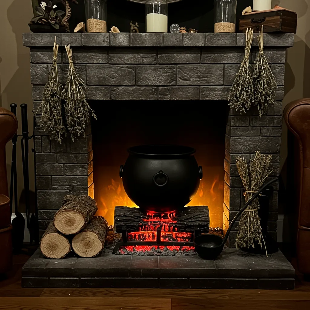 Stage a black cauldron inside a non-working fireplace. Surround with stacked “firewood,” a flicker-flame bulb or tea lights, and a bundle of witchy tools (ladle, wooden spoon, herb bundles) for storybook charm.