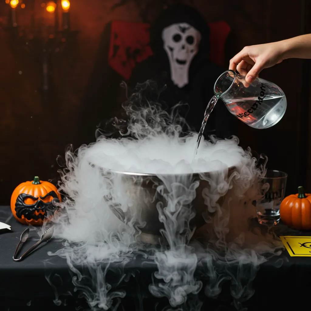 For short bursts of dramatic “boil,” float a small steel bowl with dry ice inside the cauldron, then pour in warm water right before guests arrive. Use tongs and follow safety precautions for handling.