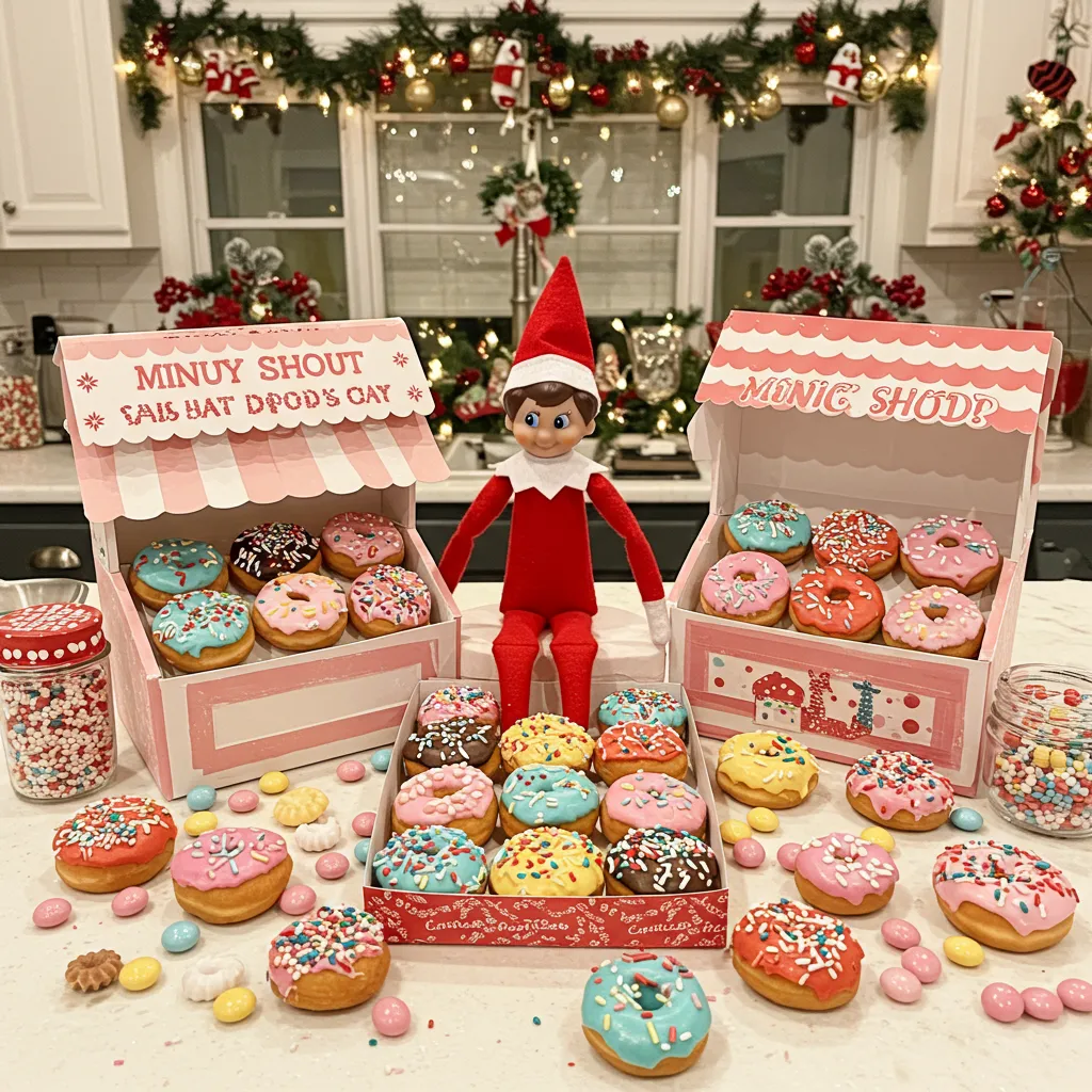 Picture this: your kids stumble into the kitchen and find their elf has basically turned it into a mini donut shop overnight! Grab some printable donut box templates online and fill a real box with a dozen donuts for the whole family. It’s breakfast and entertainment rolled into one – plus, who doesn’t love starting the day with donuts?