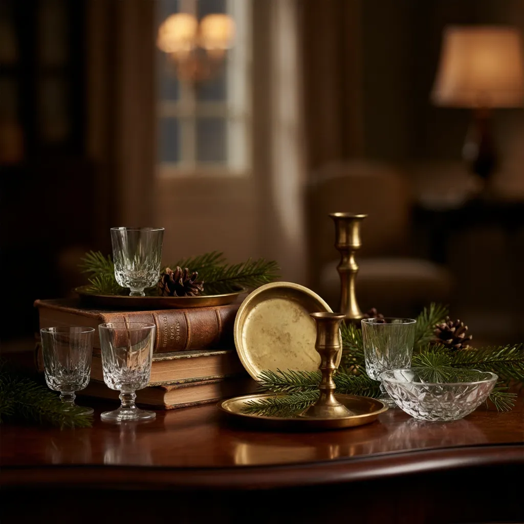 Crystal glasses, tarnished brass, a slightly crooked stack of antique books…