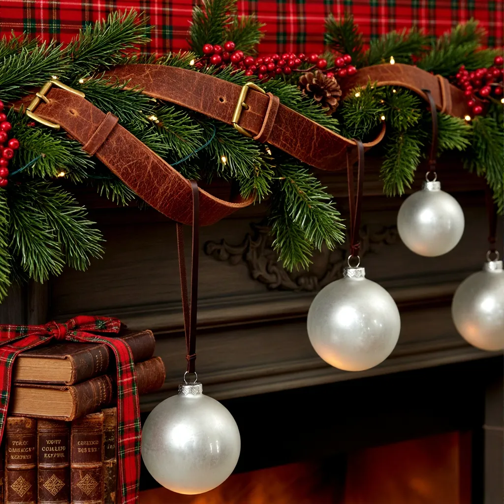 Use old leather belts as garland, leather straps for hanging ornaments, or a stack of leather-bound books tied with ribbon.